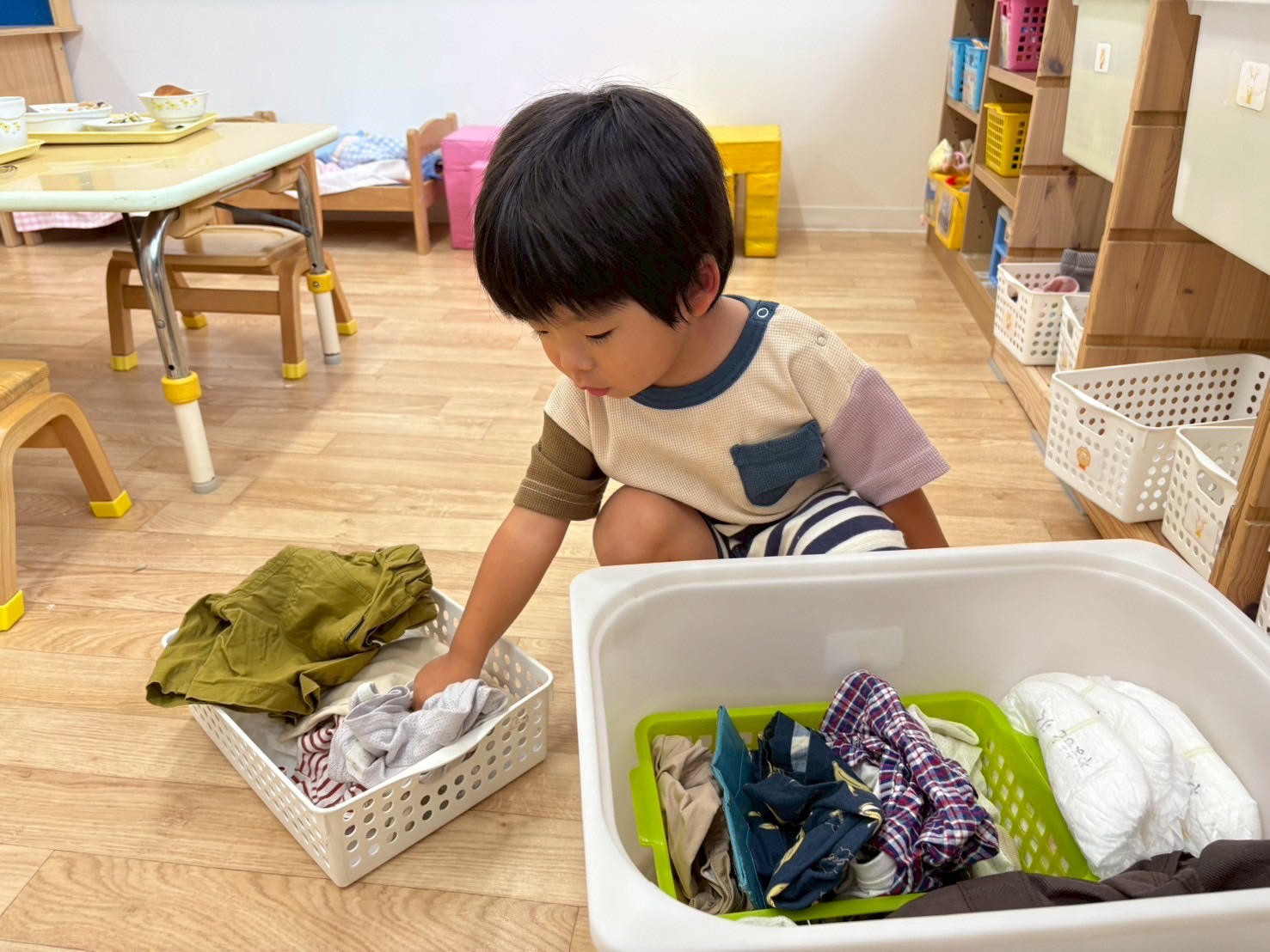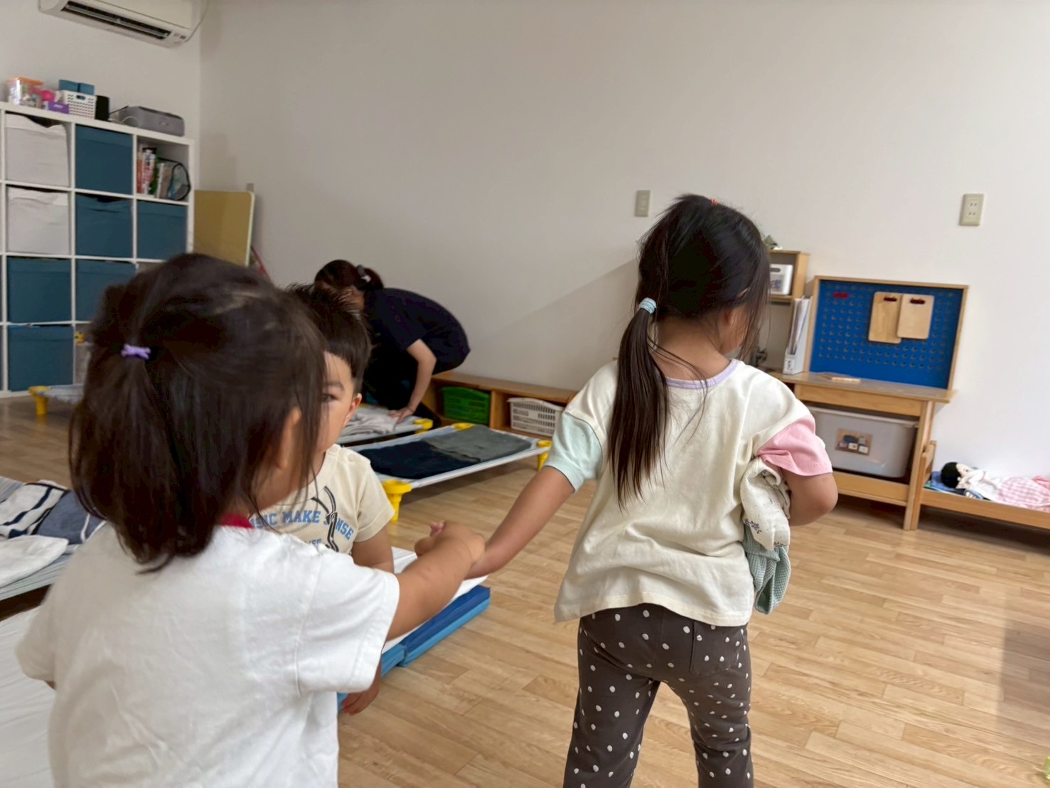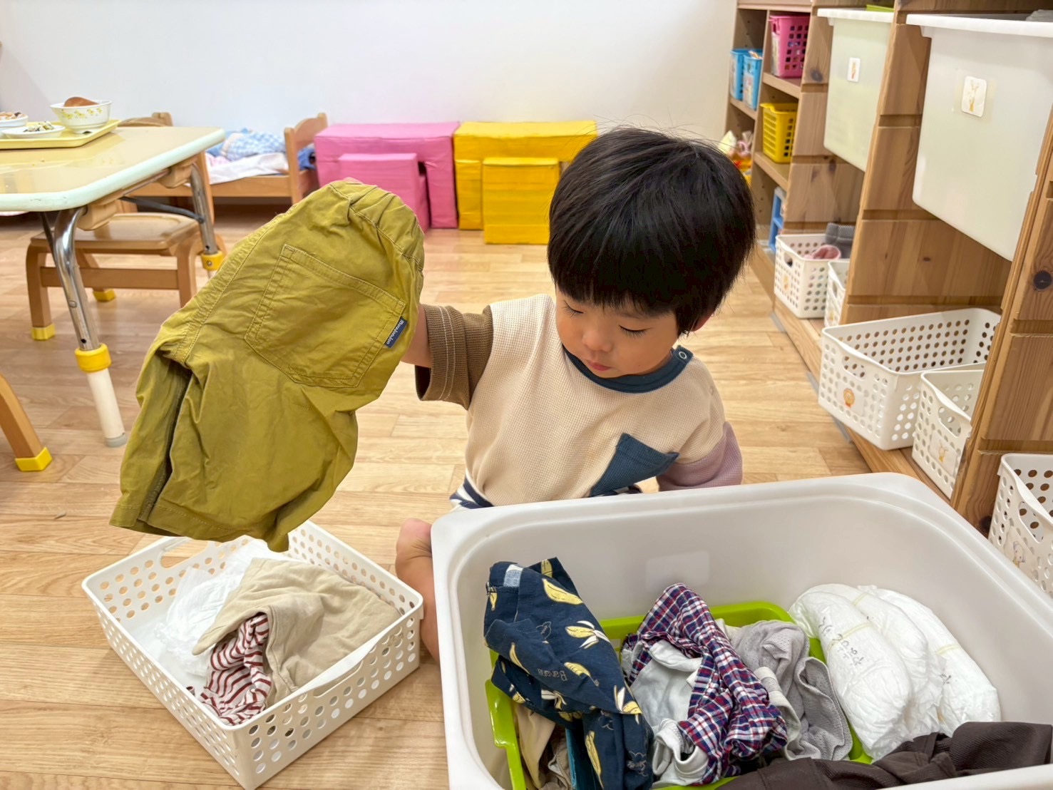 着替えはただ服を替えるだけでなく、「やってみたい!」という気持ちや、お友だちと助け合う気持ちがあふれる時間なんだなぁと感じます。
