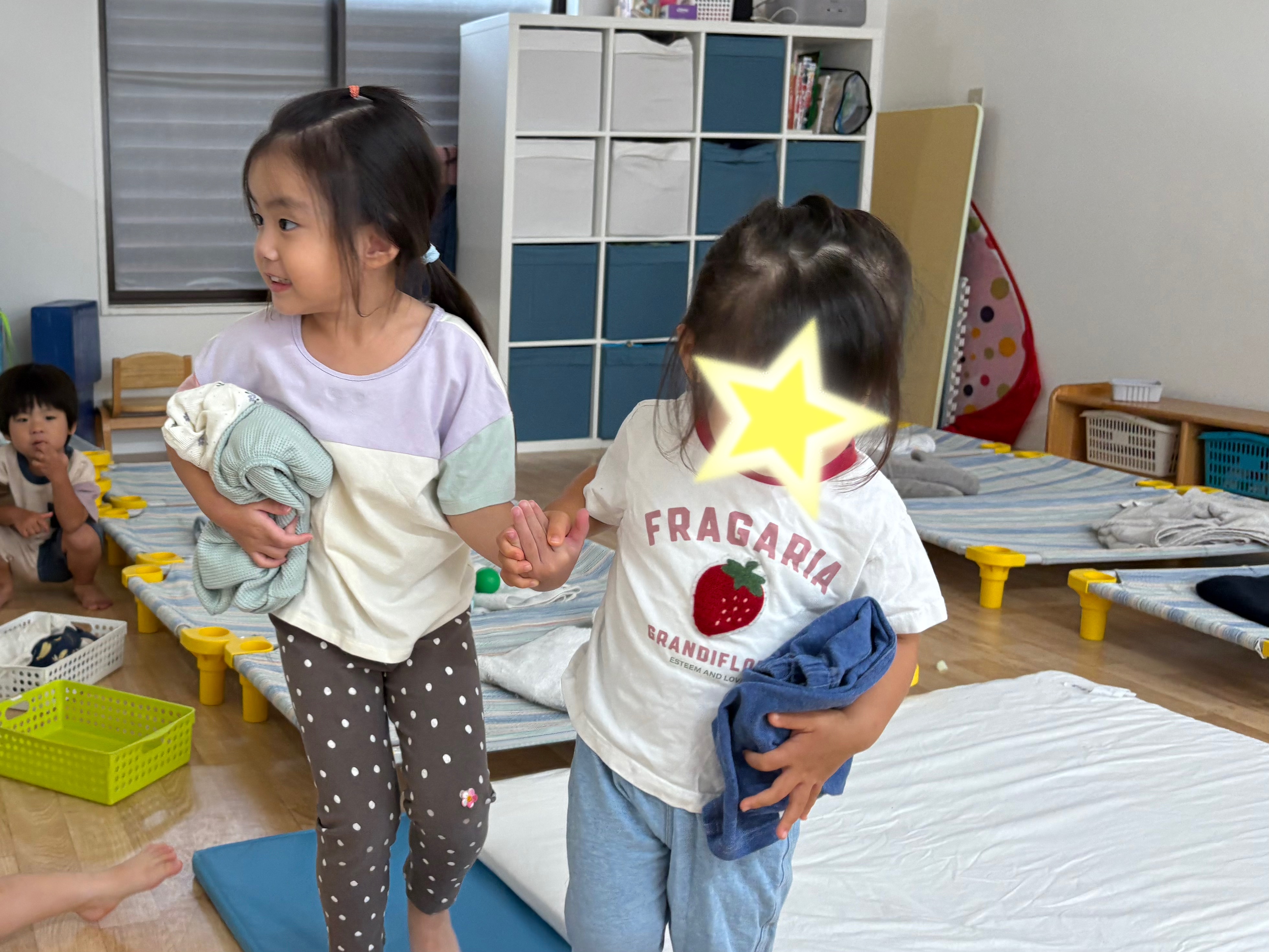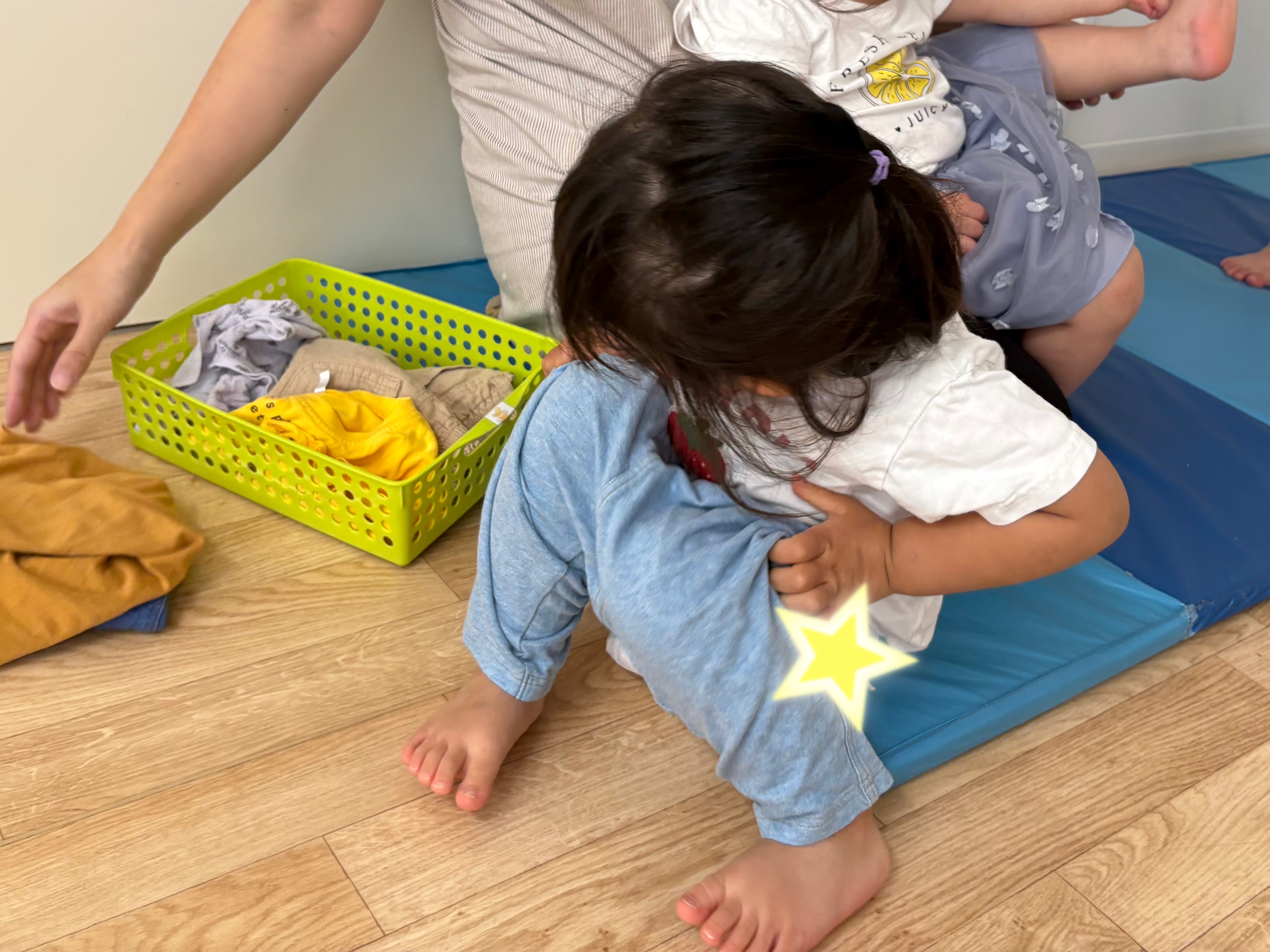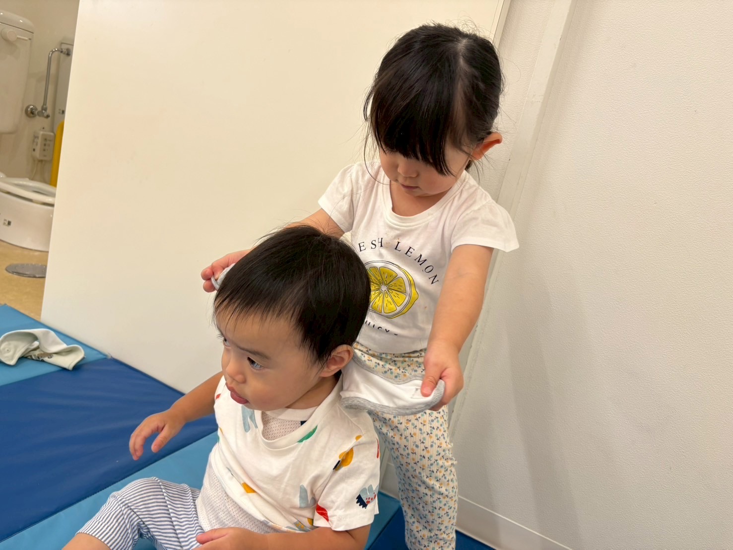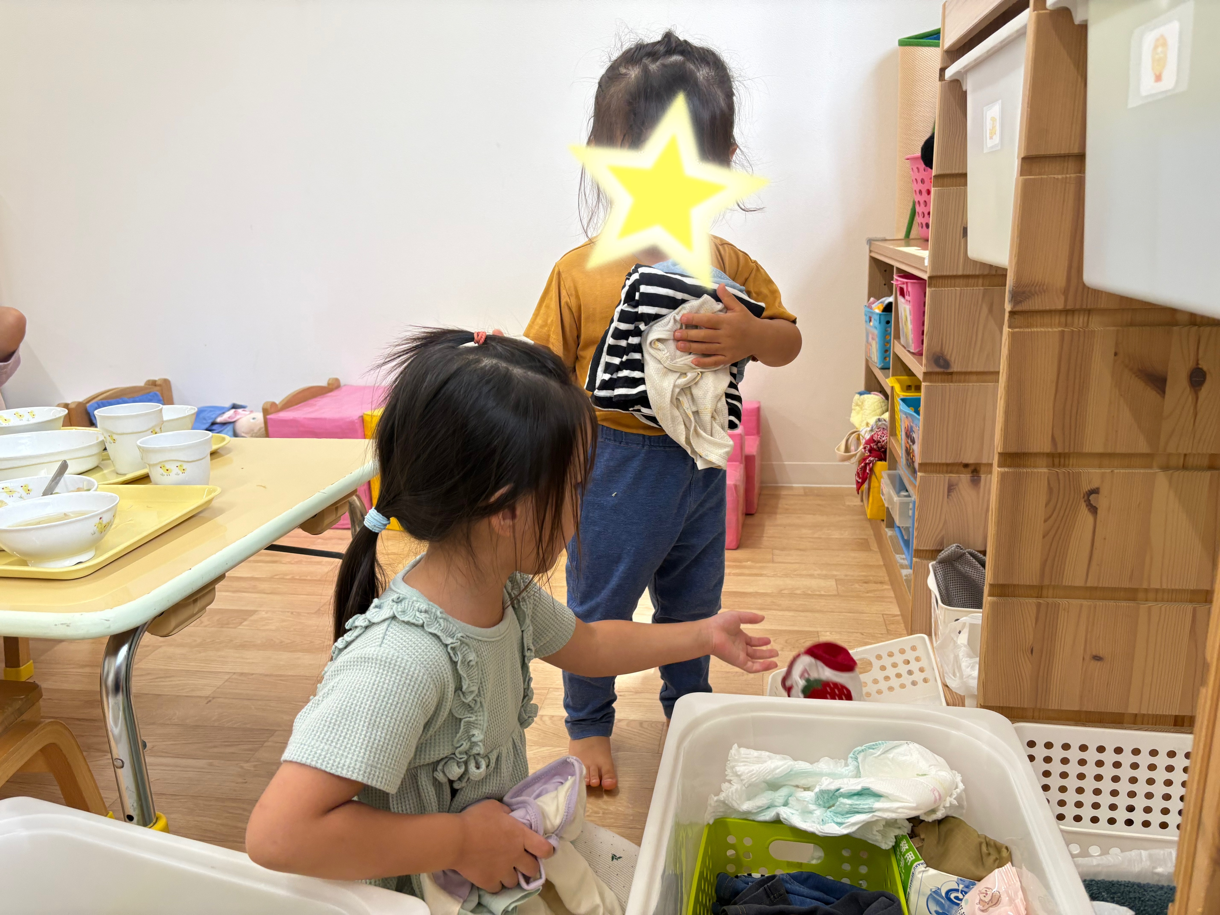 着替えはただ服を替えるだけでなく、「やってみたい!」という気持ちや、お友だちと助け合う気持ちがあふれる時間なんだなぁと感じます。