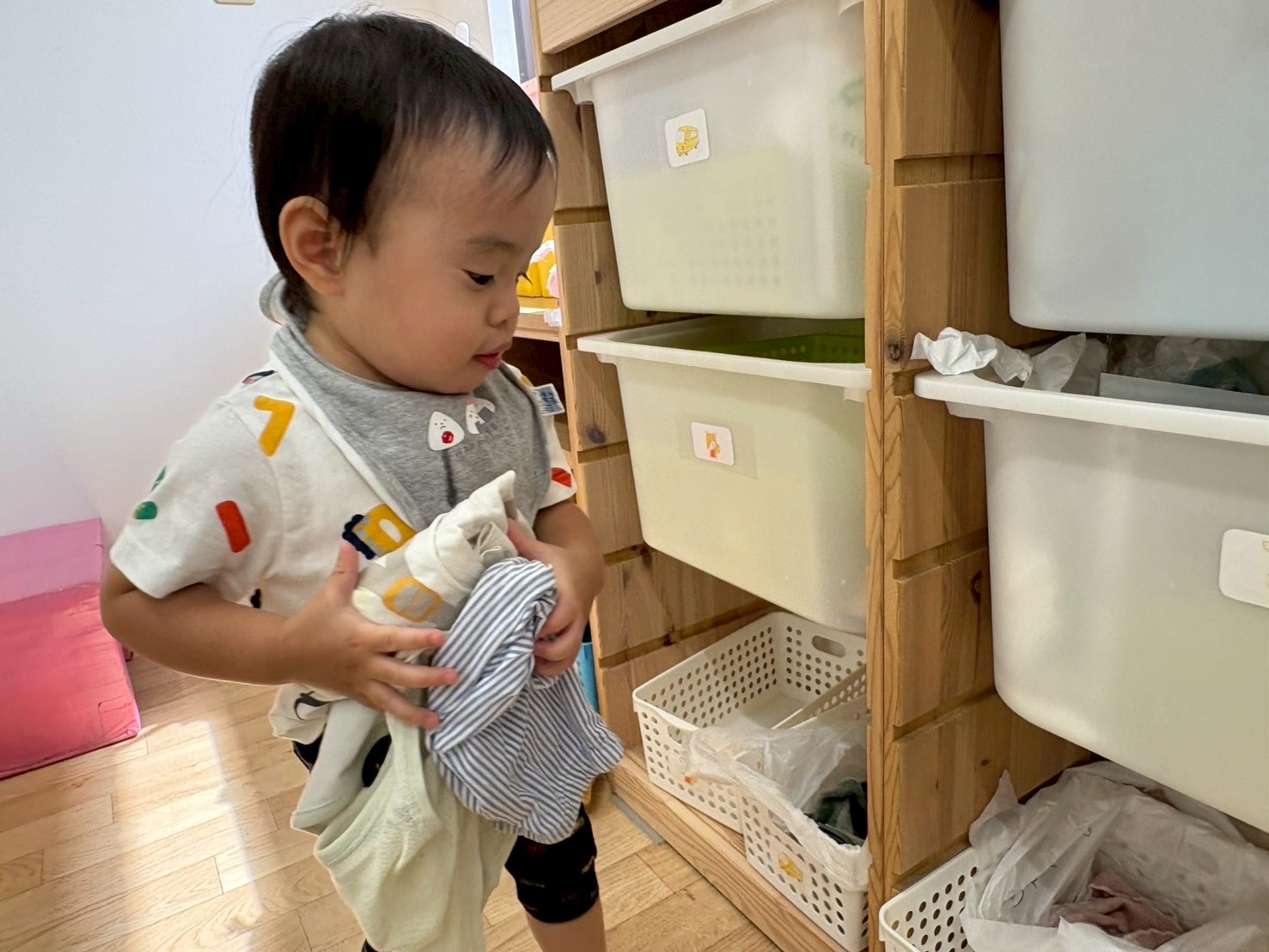 「これはベージュ!」と言いながら、服の裾を広げ、自分で着ようと頑張っていました。