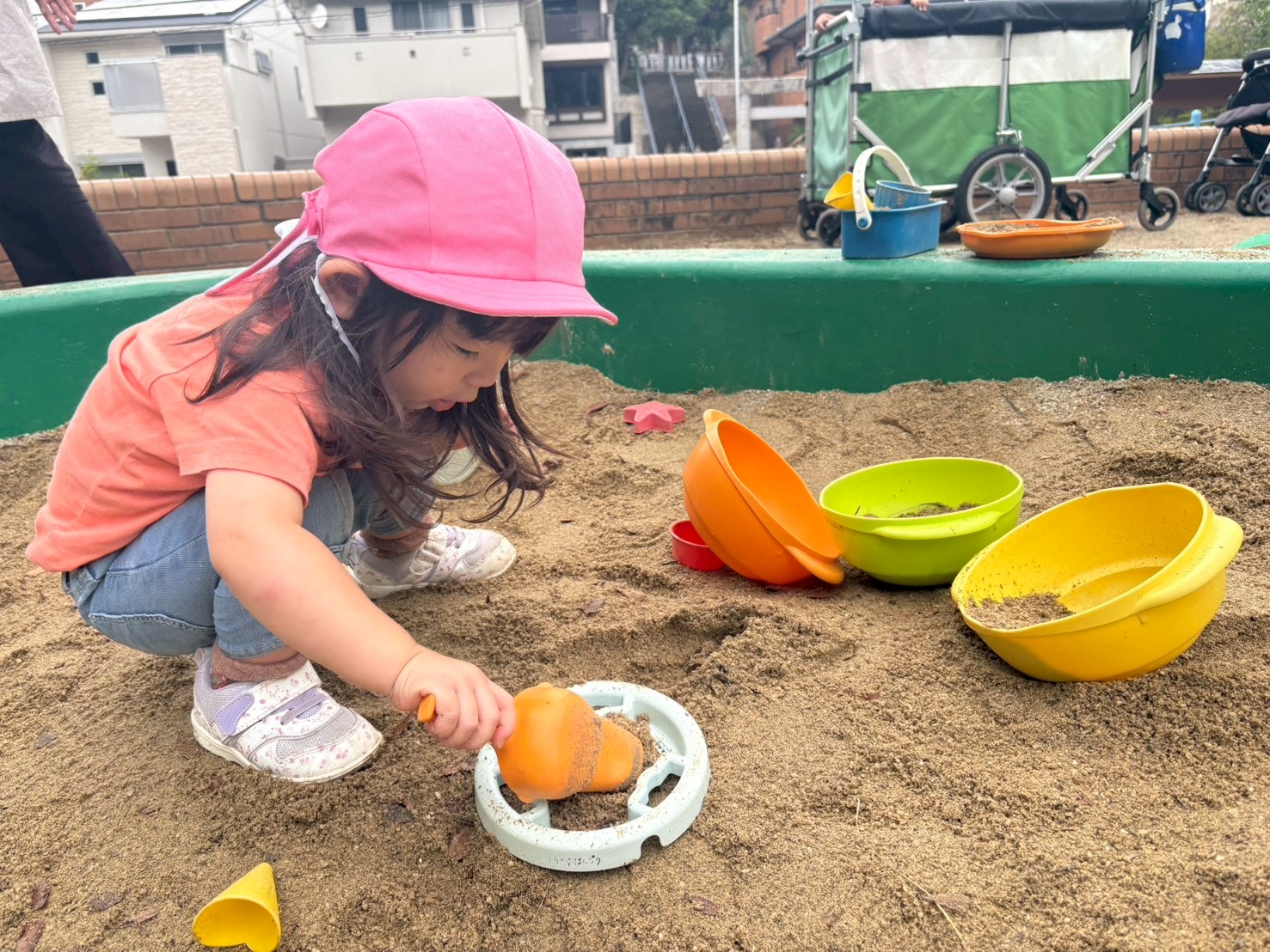 お砂場でもパン屋さんが開かれ、“焼きたてメロンパン”を先生からもらうと、「おいし〜い!」と食べる真似をしてにっこりしていました♡