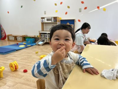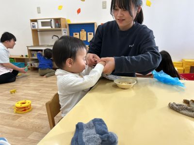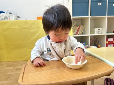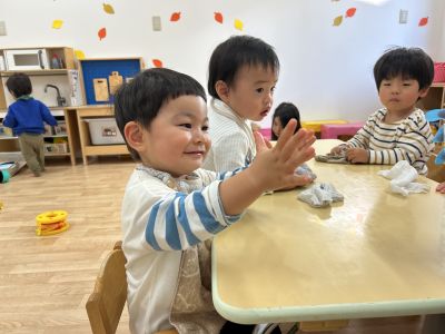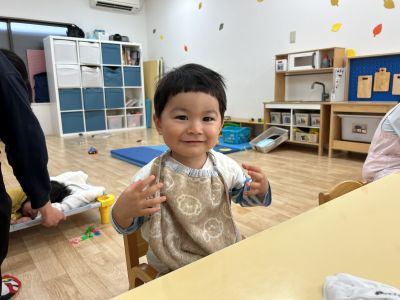ジェスチャーで保育士におやつが食べたいことを伝えています♪