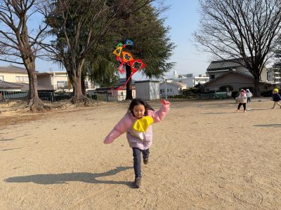 保育士がたこを持って走っていると「わぁ!たかーい!!」「まてまてー!」と
