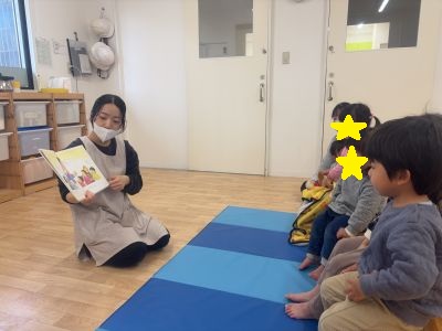 保育士が『ばばばあちゃんのおもちつき』の絵本の読み聞かせをしました。