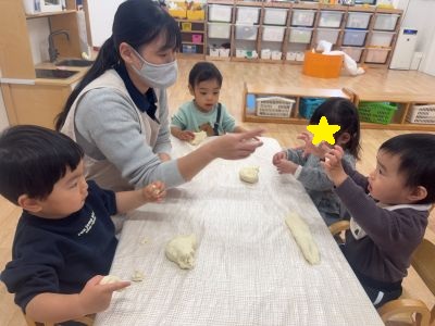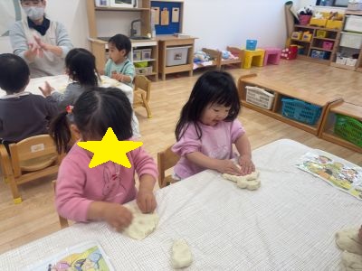 お砂場でもパン屋さんが開かれ、“焼きたてメロンパン”を先生からもらうと、「おいし〜い!」と食べる真似をしてにっこりしていました♡