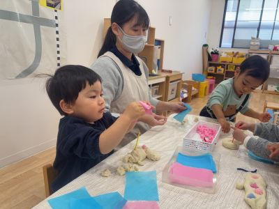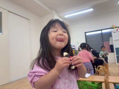 できたアイスやカップケーキを「みてみて!」と見せてくれたり、「いらっしゃいませ~あいすいかがですか?」とお店屋さんごっこをしたりして楽しむ姿が見られました♡