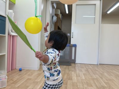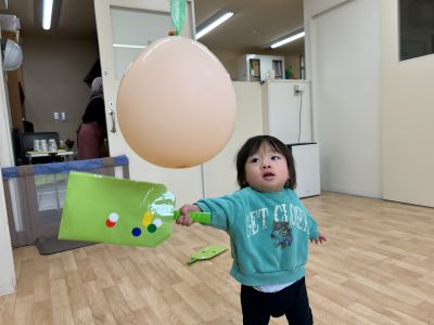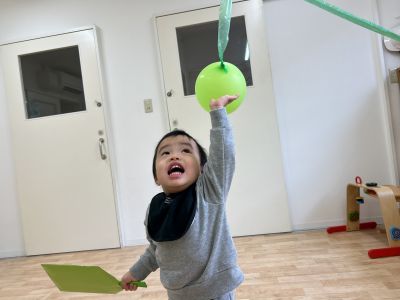 ウサギ組のお部屋では、風船を上から吊るしてはねつきをしました。