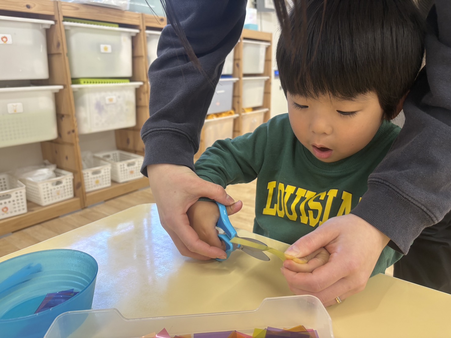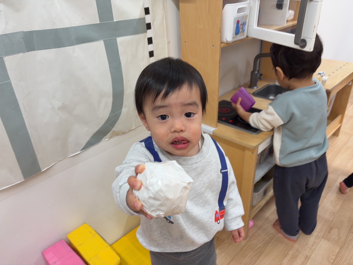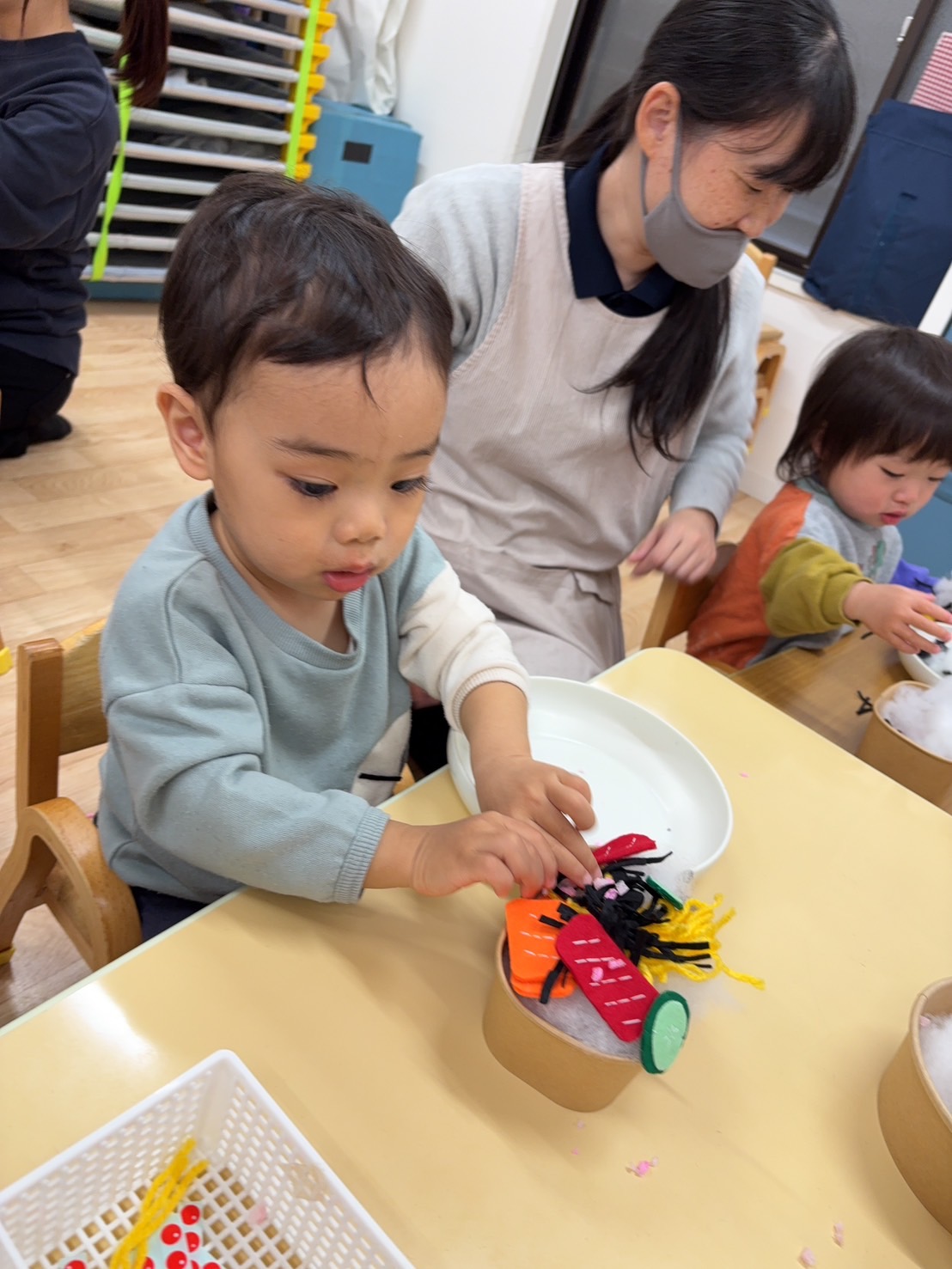 しかし上手くできない時もあり「これどーやるの?」「手伝って!」と保育士に身振りや表情で伝えています。