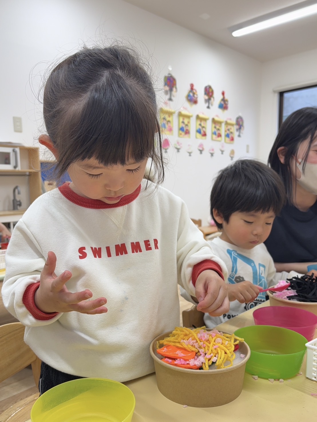 器の中に、ごはんや具材を嬉しそうにのせていました。