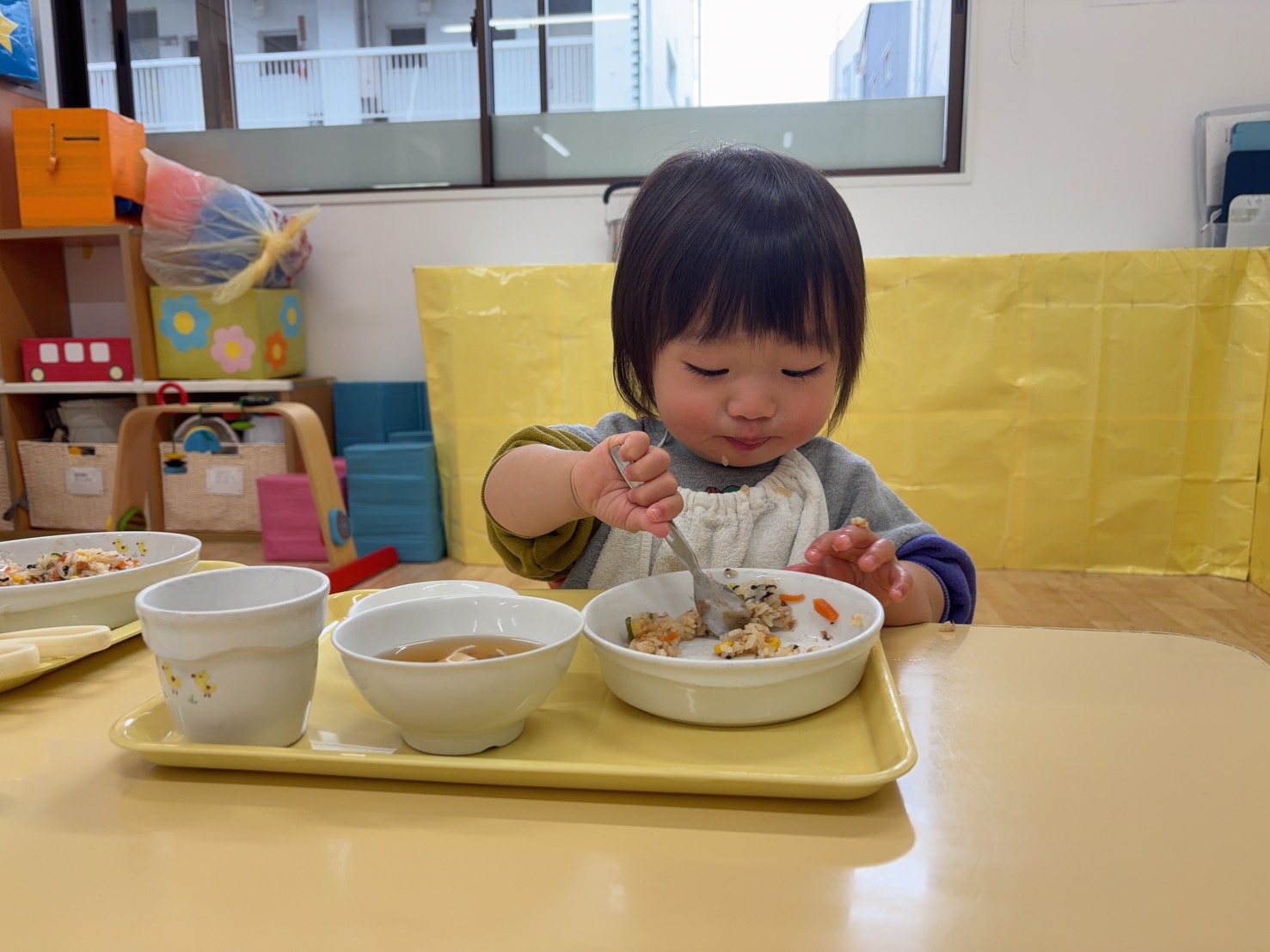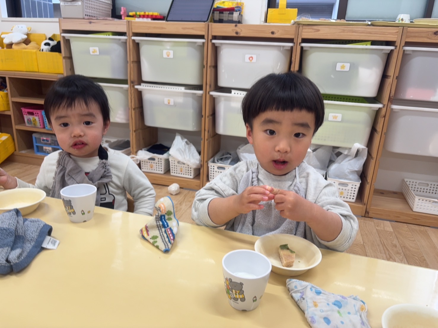 2歳児のお友だちはお話も上手になってきて給食中もお友だちや保育士と会話を楽しみながら楽しい雰囲気で食べ進めています☆