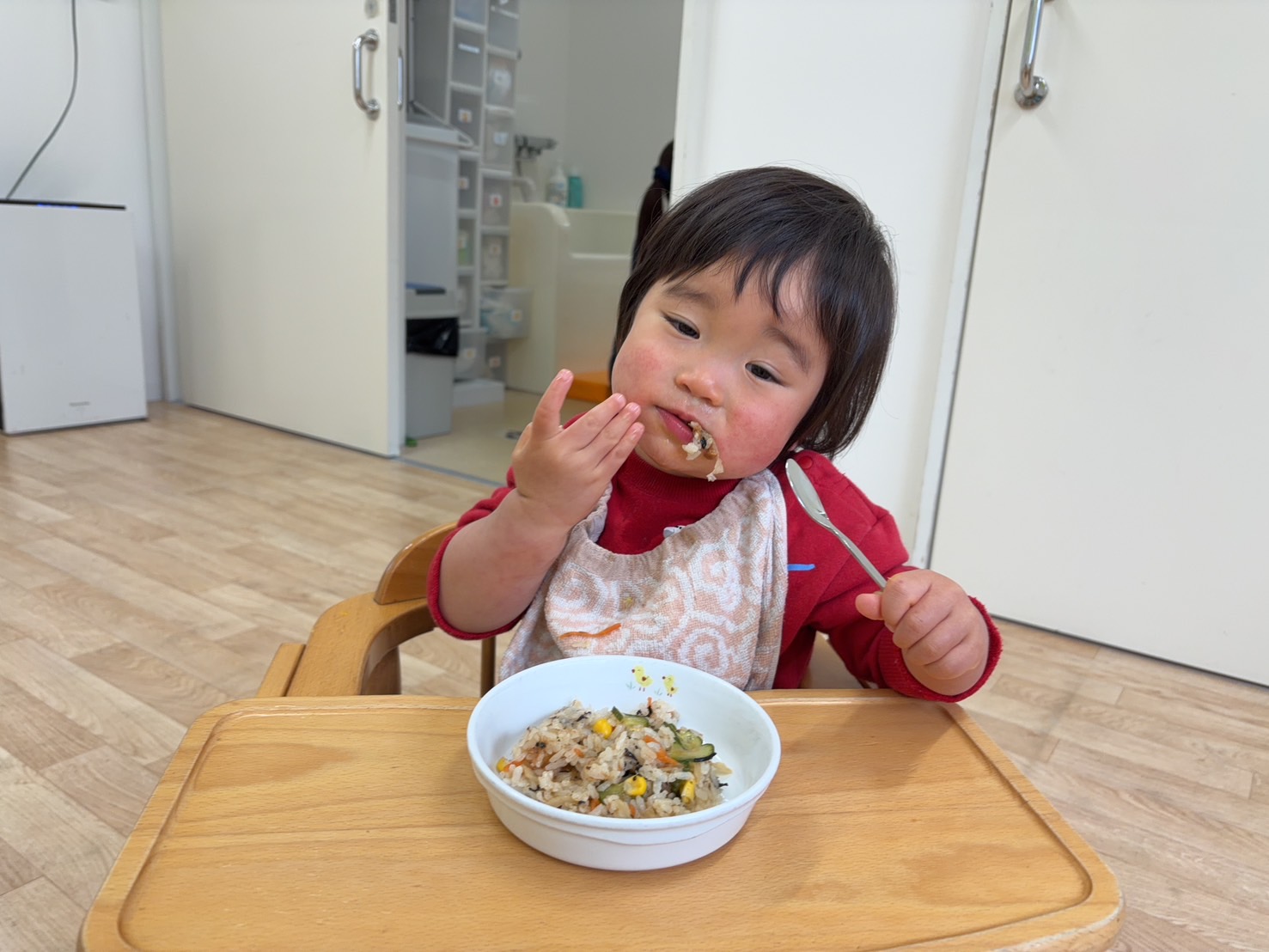 1歳児のお友だちは手づかみ食べで食べ進めることもありますが、フォークやスプーンを頑張って使おうとする姿も見られます。