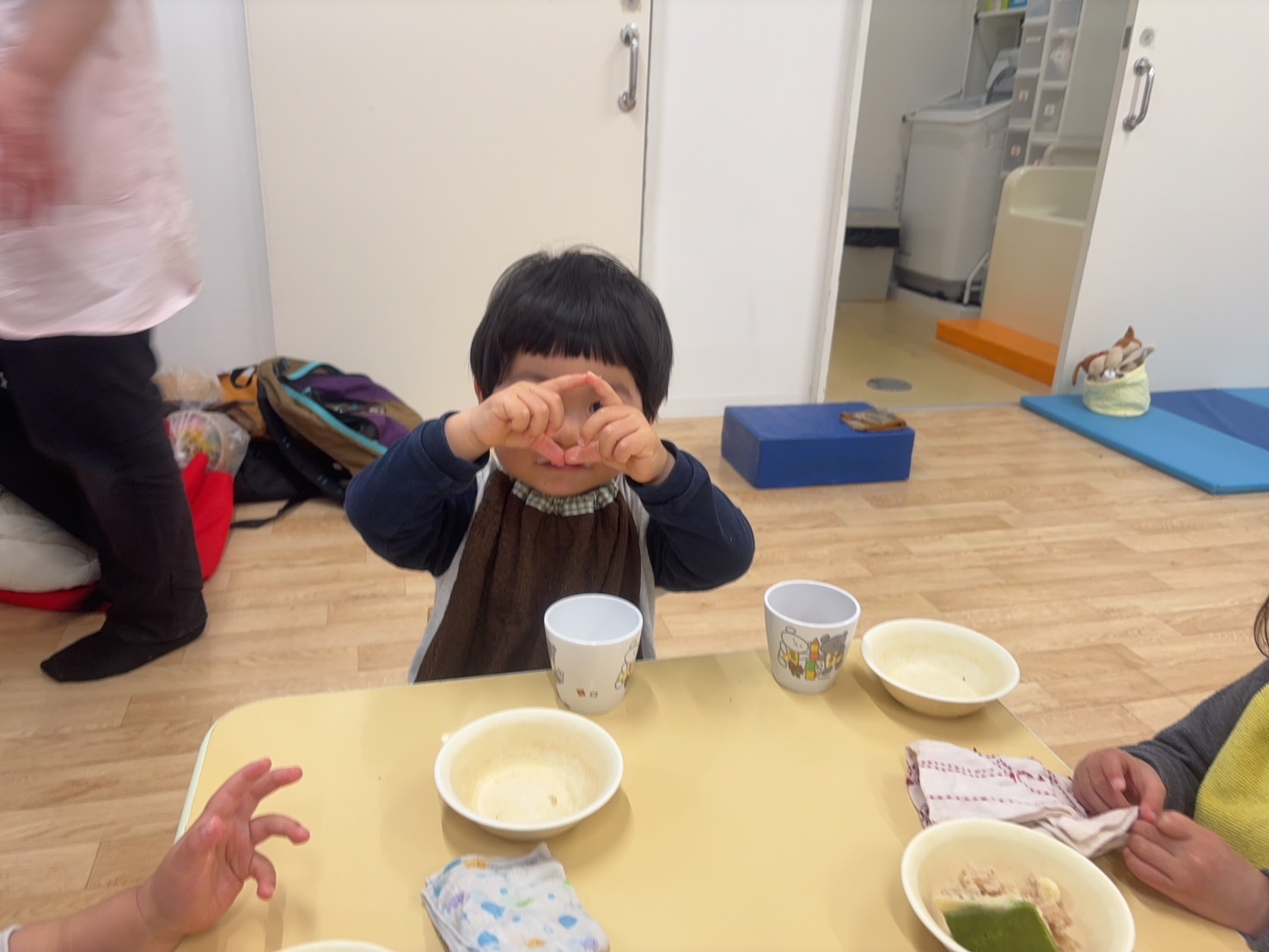 ジェスチャーで保育士におやつが食べたいことを伝えています♪