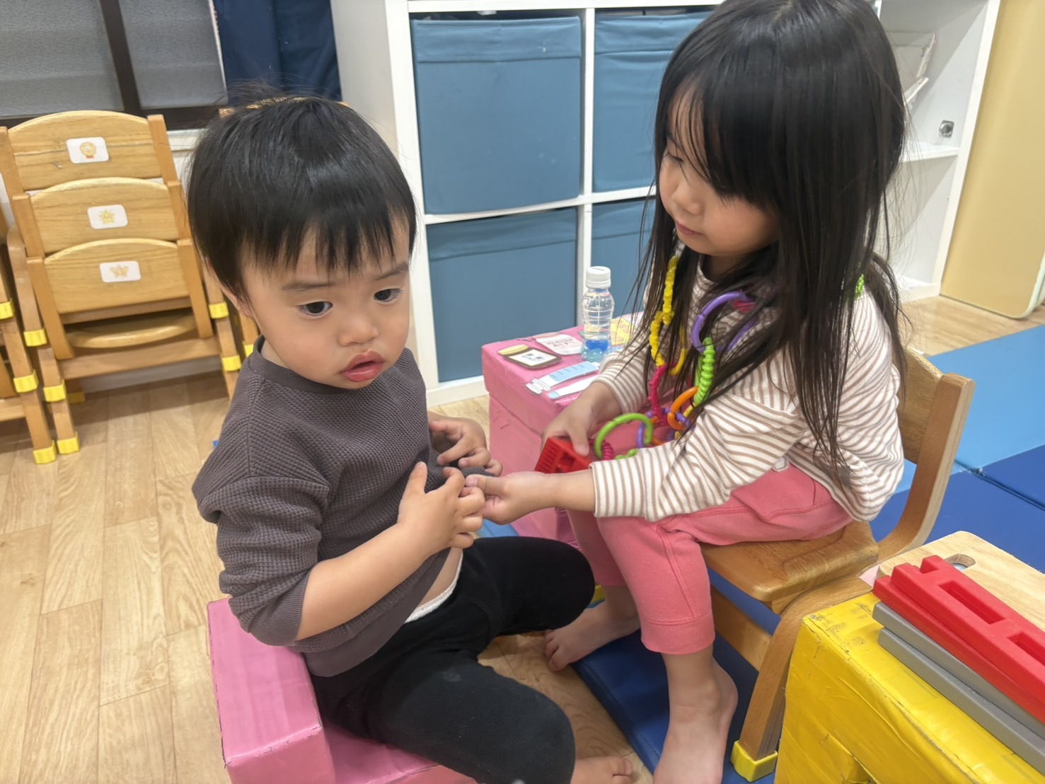 着替えが終わったあと、仲良しのお友達と一緒に大好きな車で遊んでいたお友達。